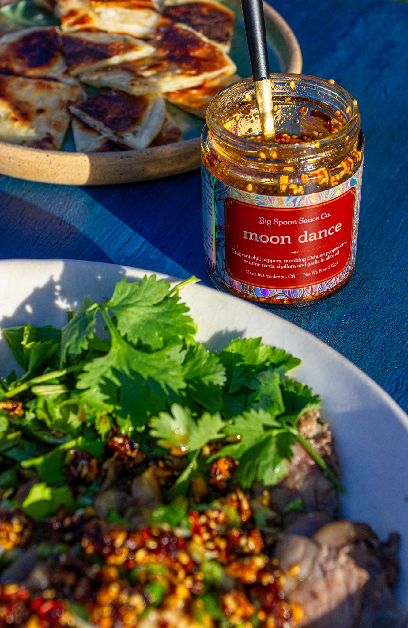 Moon Dance features 100% Asian heritage pepper varieties grown entirely in western Sonoma County. They were propagated by farmers and seed stewards with the goal of championing sustainable farming practices and heirloom seed cultivation. Leslie Wiser of Radical Family Farms in Sebastopol grew the Er Jing Tiao peppers 二荆条 that make up the base of this special sauce. Ranging from medium to supremely spicy, Er Jing Tiaos are the classic long red chili pepper made famous by just about every Sichuan staple we know and love, from hot pot to mapo tofu. Next, we layered on a complex blend of spicy peppers grown by Scott Chang-Fleeman of Shao Shan Farms, which is nestled deep in the redwood forests of Green Valley. They include Chinese Paper Lantern peppers 灯笼椒, Xiao Mi La peppers 小米辣, and Korean Gyopo peppers 교포고추. Many of the original seeds at Shao Shan Farms were cultivated by the heartful hands of Kristyn Leach from Second Generation Seeds with the very mission of preserving, adapting, and breeding beloved Asian diaspora crops in California. Total rockstars, right?